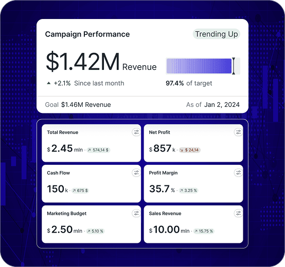 Marketing performance changes in small ways first: one channel gets more expensive, a landing page softens on mobile, or a new campaign shifts conversion quality. Fusedash generates a marketing dashboard that connects spend to outcomes so your team can pace budget, measure experiments, and decide what to scale without guessing. This page is for internal marketing optimization. If you are building client-facing reporting, see the Client Dashboard.