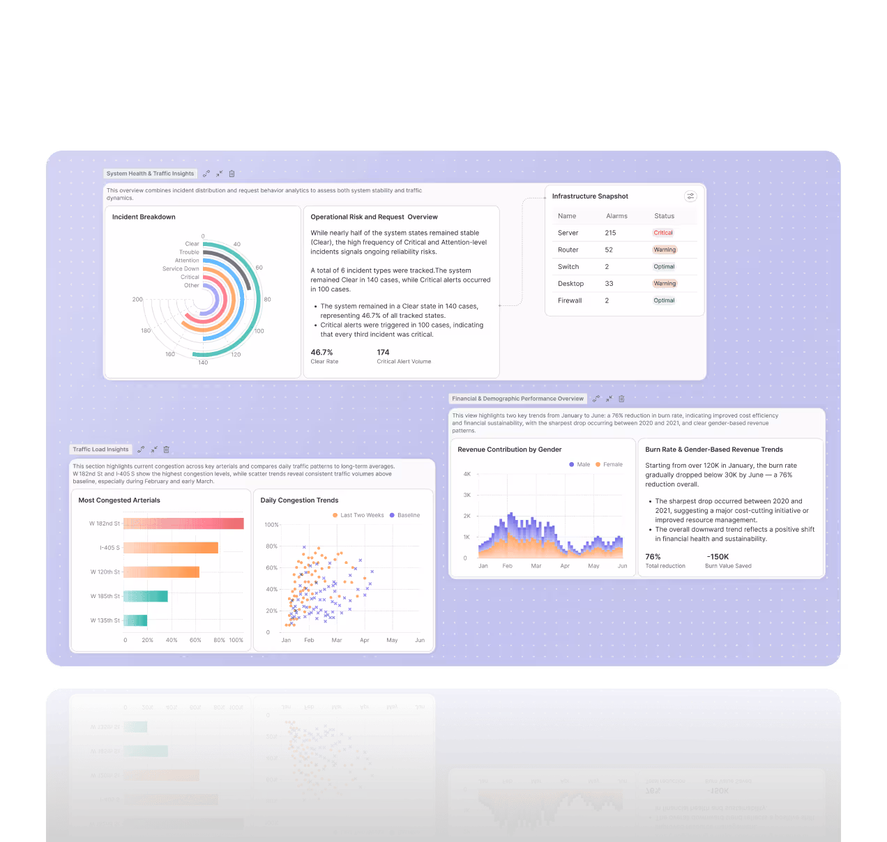 Set thresholds and rules that highlight changes instantly, like sudden drops, unusual spikes, or SLA risks. Get notified and react faster without watching the dashboard all day.
