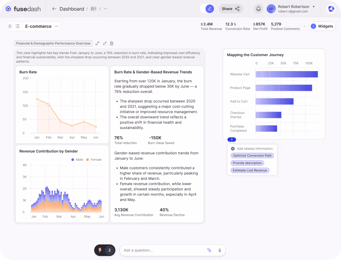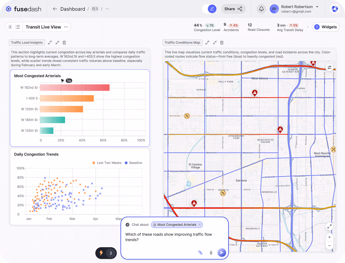Fusedash dashboards allow users to bring data to life with fully customized, interactive, AI-powered visualizations. Whether tracking business performance, monitoring KPIs, or analyzing trends, our intuitive system creates the perfect dashboard to help make data interpretation effortless. As a cutting-edge data visualization tool, Fusedash simplifies complex information, making it easy for anyone to build their own custom dashboard.