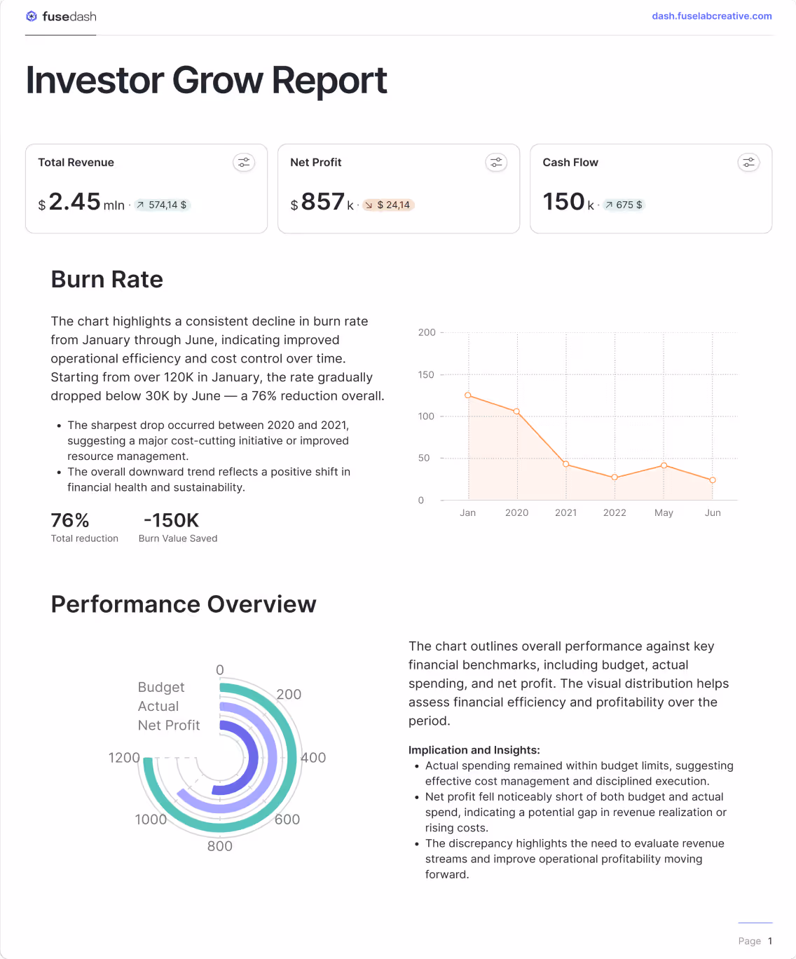 Create a clear investor story with storytelling charts that explain performance, not just results. Highlight revenue growth, burn, retention, and projections, then annotate the drivers behind changes so stakeholders understand what happened and why.